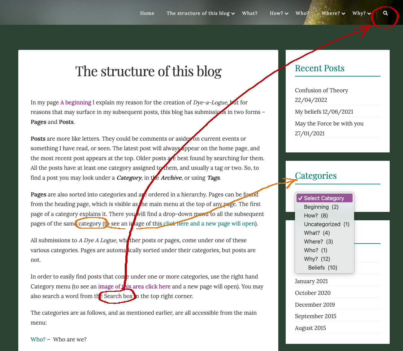 In order to easily find posts that come under one or more categories, use the right hand Category menu (to see an image of this area click here and a new page will open). You may also search a word from the Search box in the top right corner.